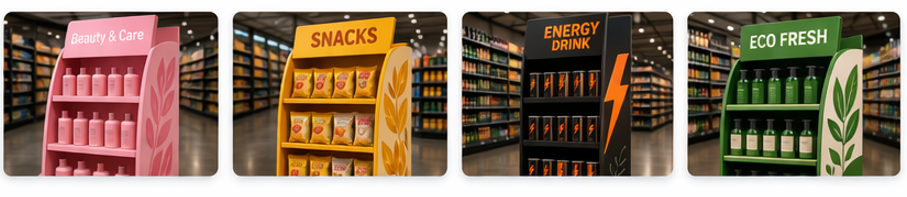 Pokazujemy przykładowe stojaki kartonowe dla różnych branż i produktów. Każdy projekt przygotowujemy indywidualnie, z pełną możliwością personalizacji formy, wymiaru, grafiki i sposobu ekspozycji. Dzięki temu jesteśmy w stanie dopasować projekt do praktycznie każdego produktu i scenariusza sprzedaży.