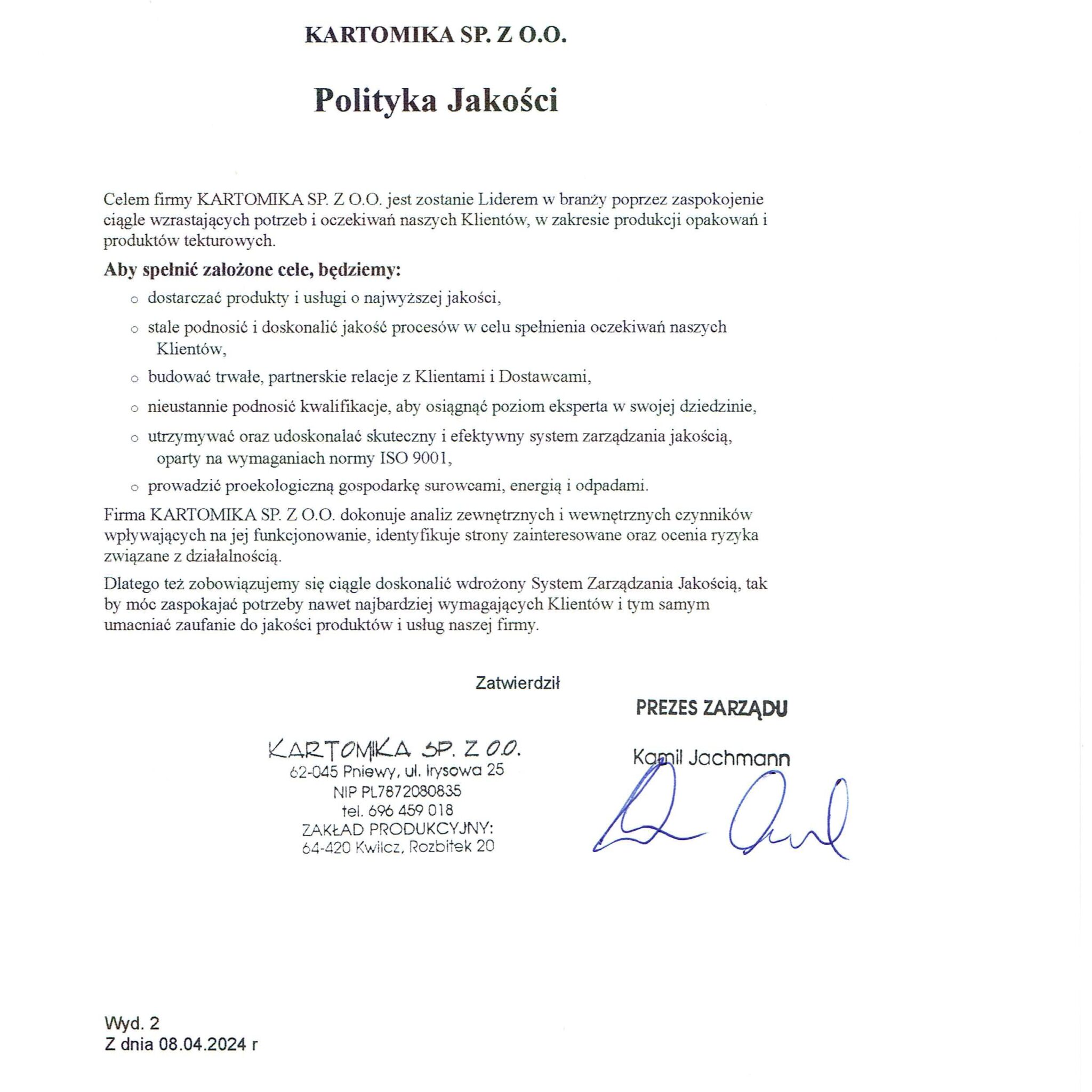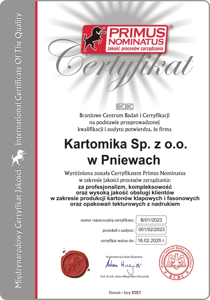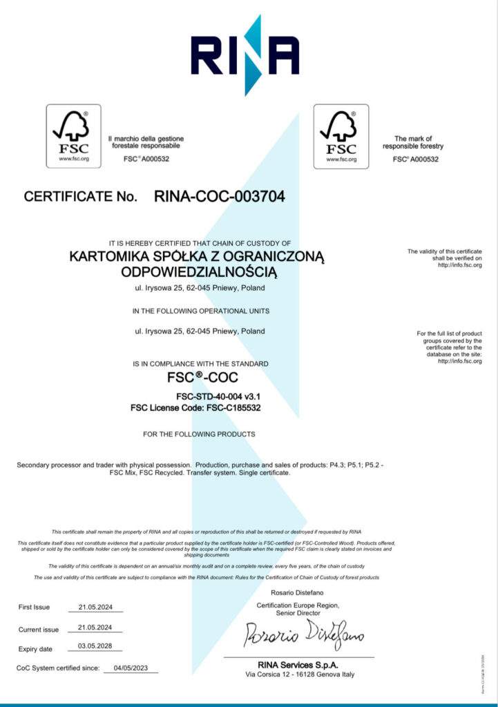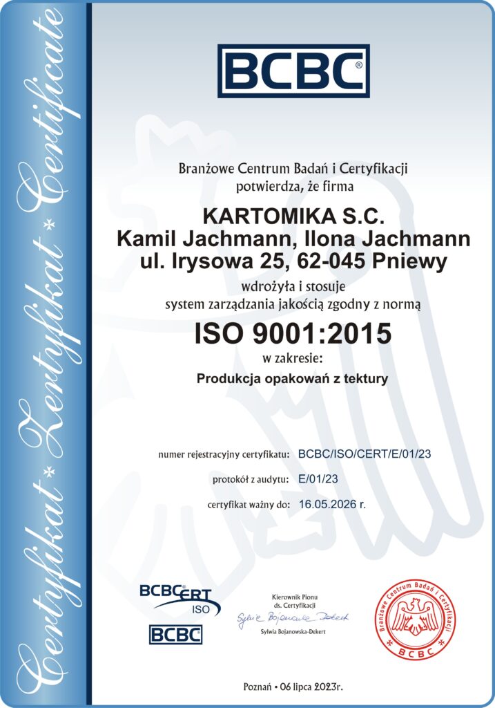 Pracujemy w oparciu o wdrożony system zarządzania jakością zgodny z normą ISO 9001 oraz certyfikaty potwierdzające standardy produkcji, w tym FSC® dla materiałów papierowych.